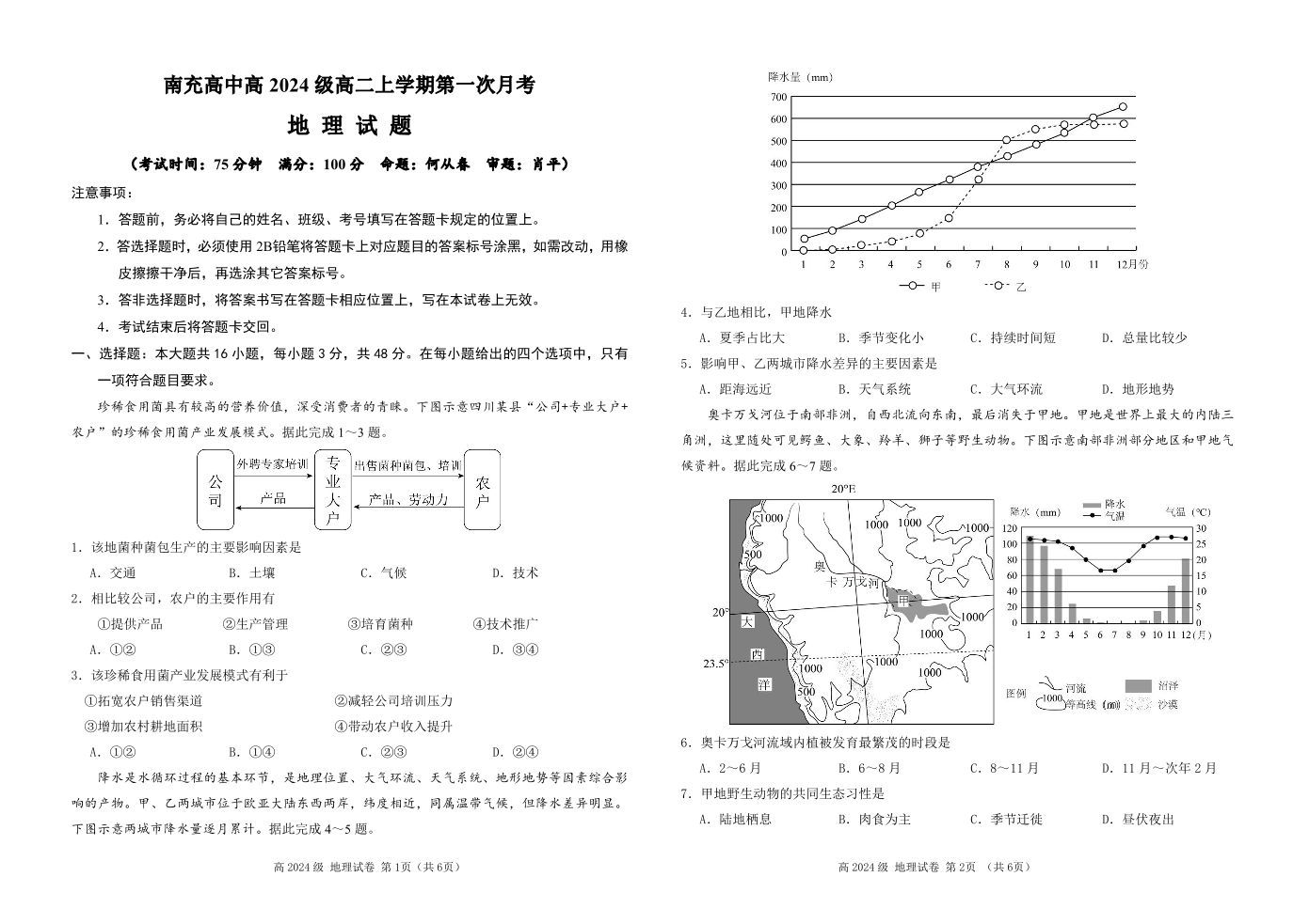 高二地理--四川省南充高级中学2025-2026学年高二上学期10月月考