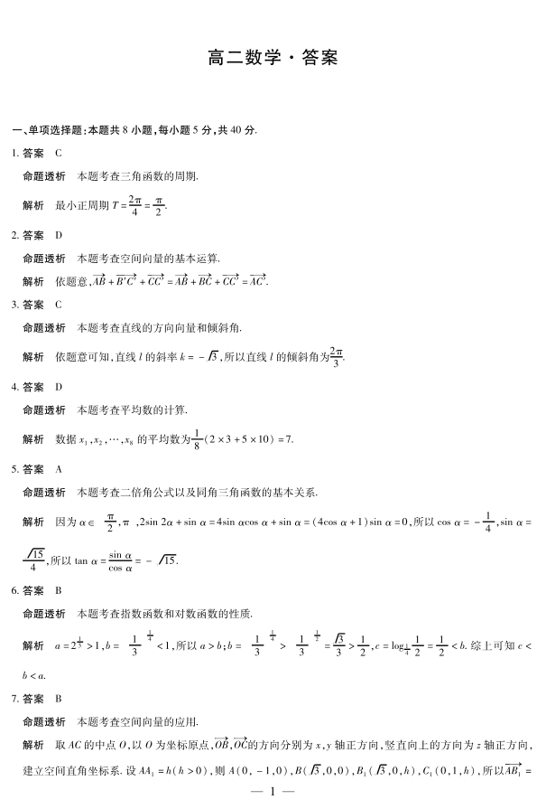 高二数学答案--湖南省天一大联考2025-2026学年高二上学期10月联考