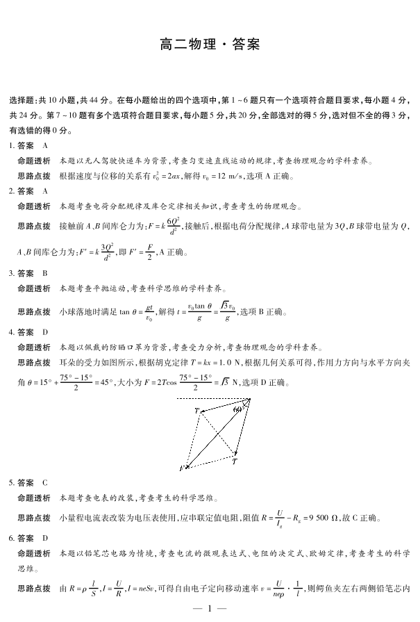高二物理答案--湖南省天一大联考2025-2026学年高二上学期10月联考