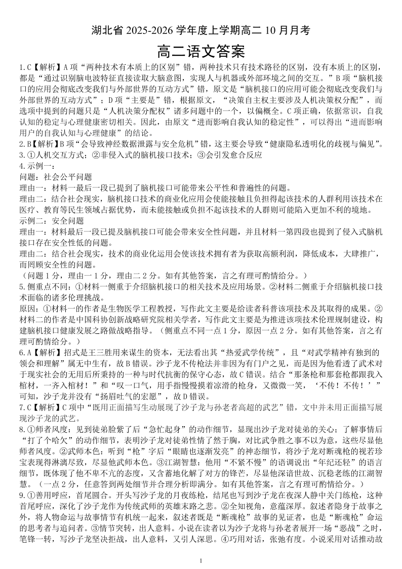高二语文答案--湖北省新八校联考2025-2026学年度上学期高二10月月考