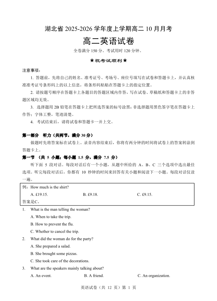 高二英语--湖北省新八校联考2025-2026学年度上学期高二10月月考