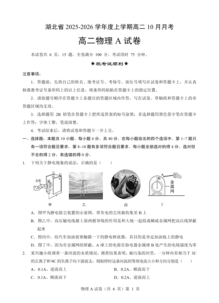 高二物理A--湖北省新八校联考2025-2026学年度上学期高二10月月考
