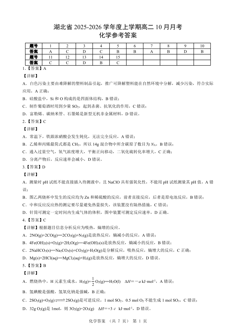 高二化学答案--湖北省新八校联考2025-2026学年度上学期高二10月月考