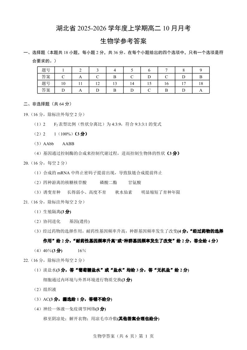 高二生物答案--湖北省新八校联考2025-2026学年度上学期高二10月月考
