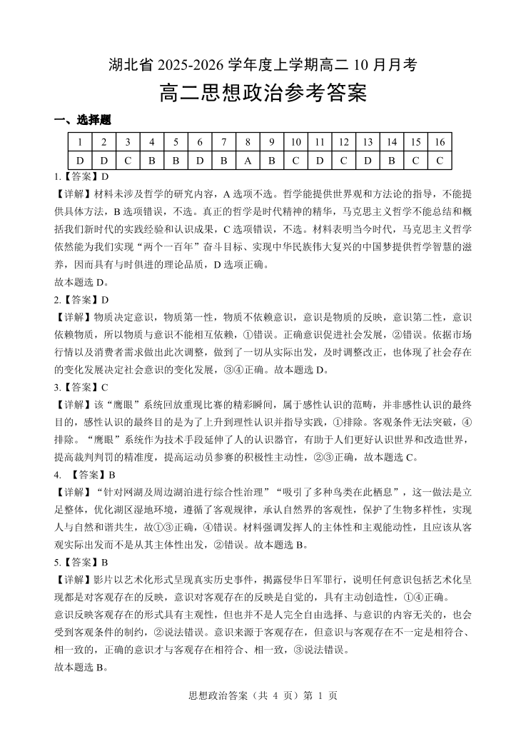 高二政治答案--湖北省新八校联考2025-2026学年度上学期高二10月月考