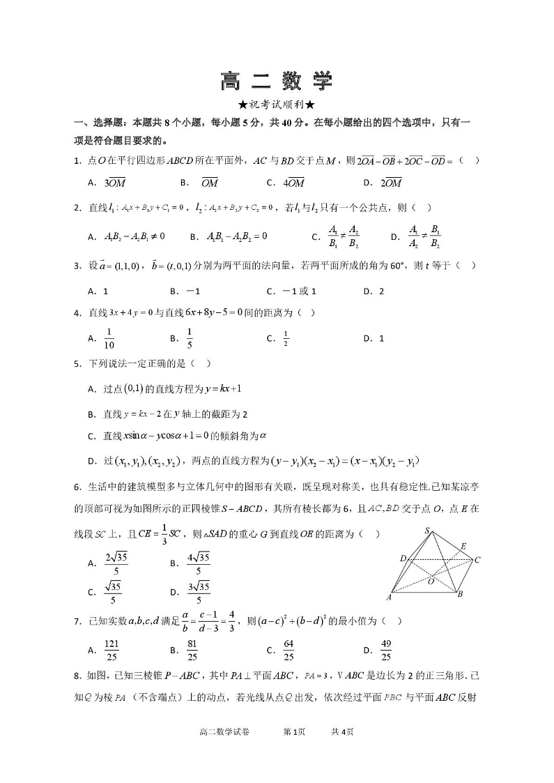 高二数学--湖北省武汉市部分重点中学2025-2026学年高二上学期10月月考
