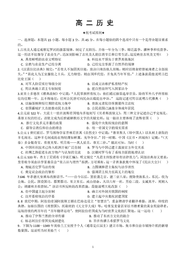 高二历史--湖北省武汉市部分重点中学2025-2026学年高二上学期10月月考