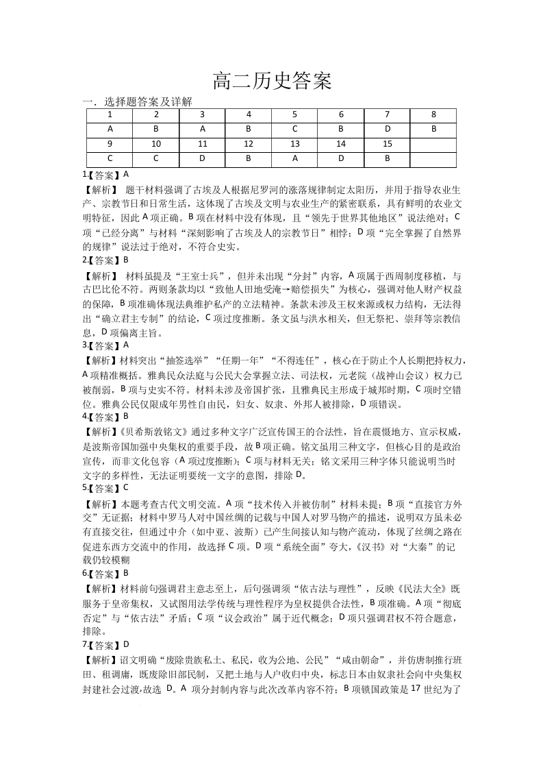 高二历史答案--湖北省武汉市部分重点中学2025-2026学年高二上学期10月月考