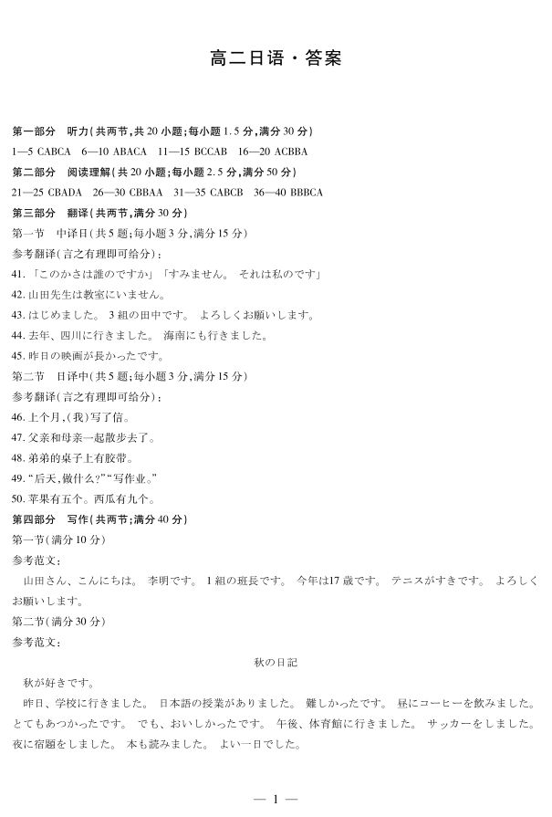 高二日语答案--湖南省天一大联考2025-2026学年高二上学期10月联考