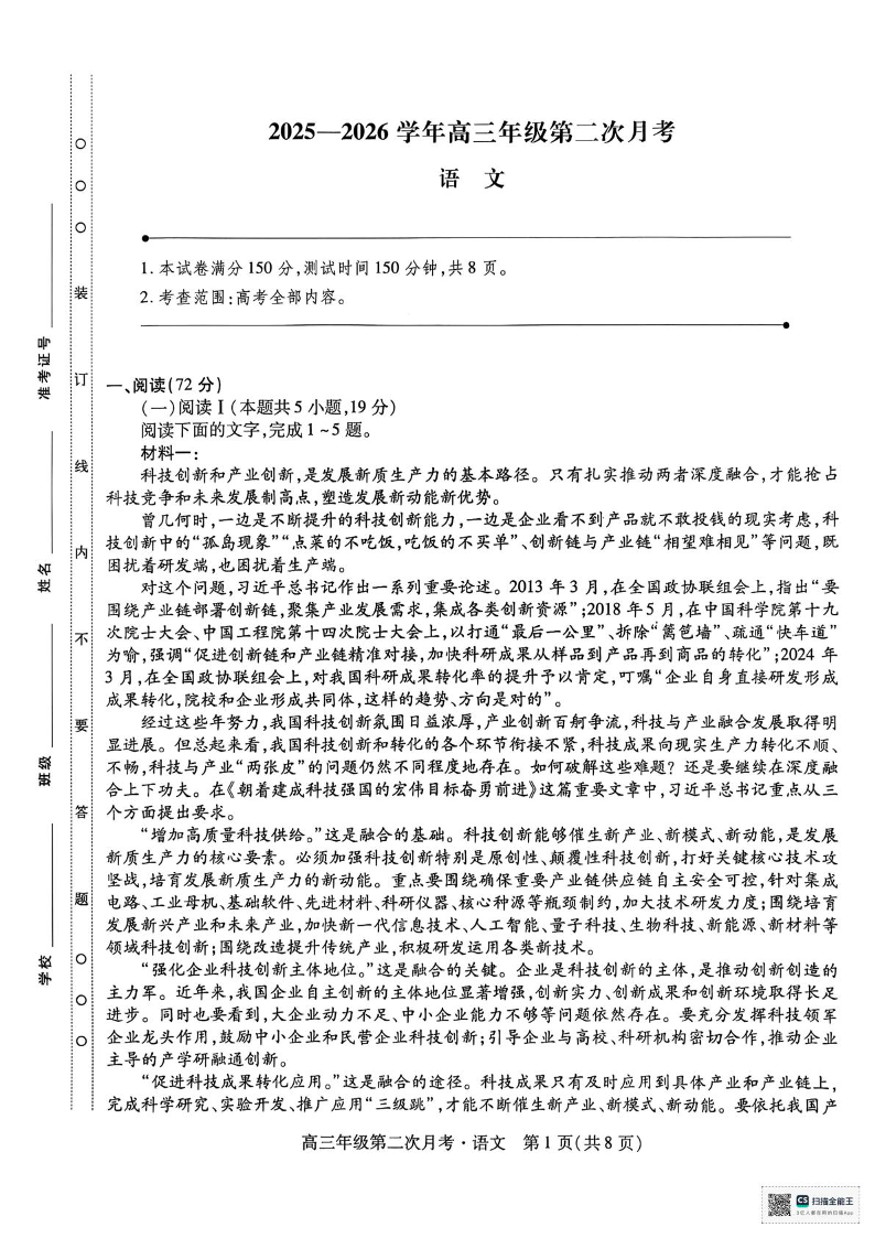 高三语文--海南省部分学校2026届高三上学期第二次月考