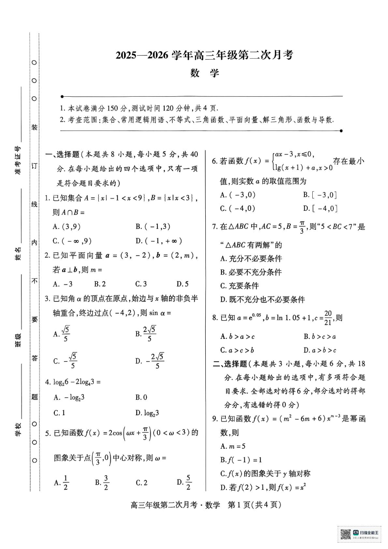高三数学--海南省部分学校2026届高三上学期第二次月考