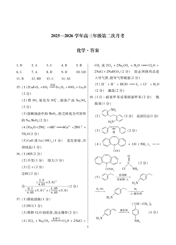 高三化学答案--海南省部分学校2026届高三上学期第二次月考