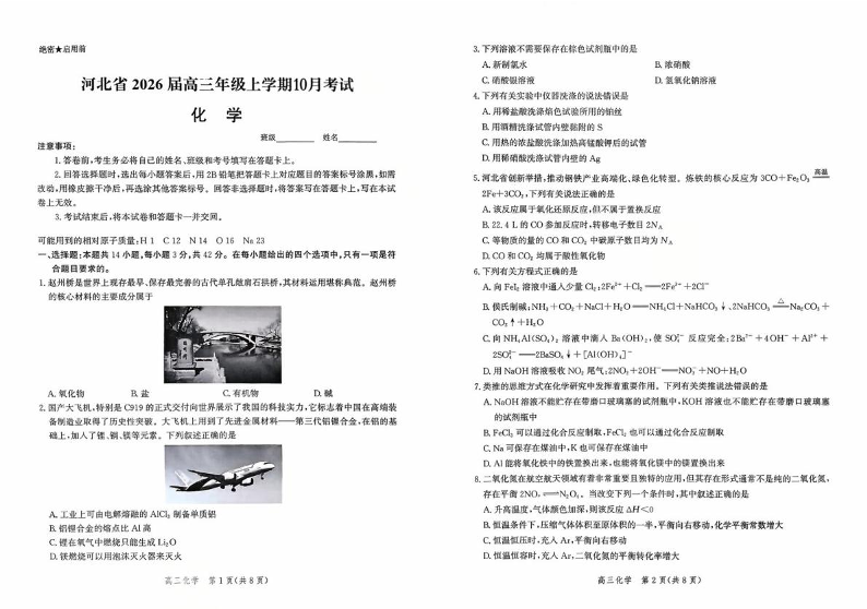 高三化学+答案--河北省示范高中联盟2026届高三上学期10月月考
