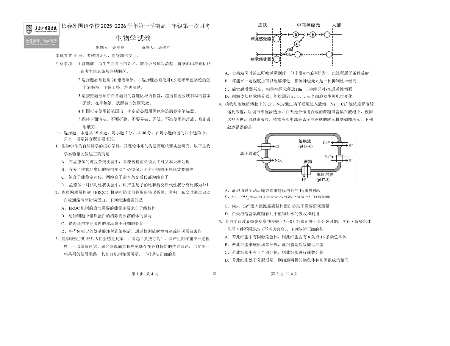 高三生物+答案--吉林省长春外国语学校2026届高三上学期10月月考