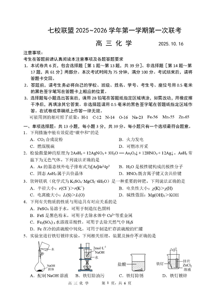 高三化学+答案--江苏省扬州市七校联盟2026届高三上学期第一次联考(10月)