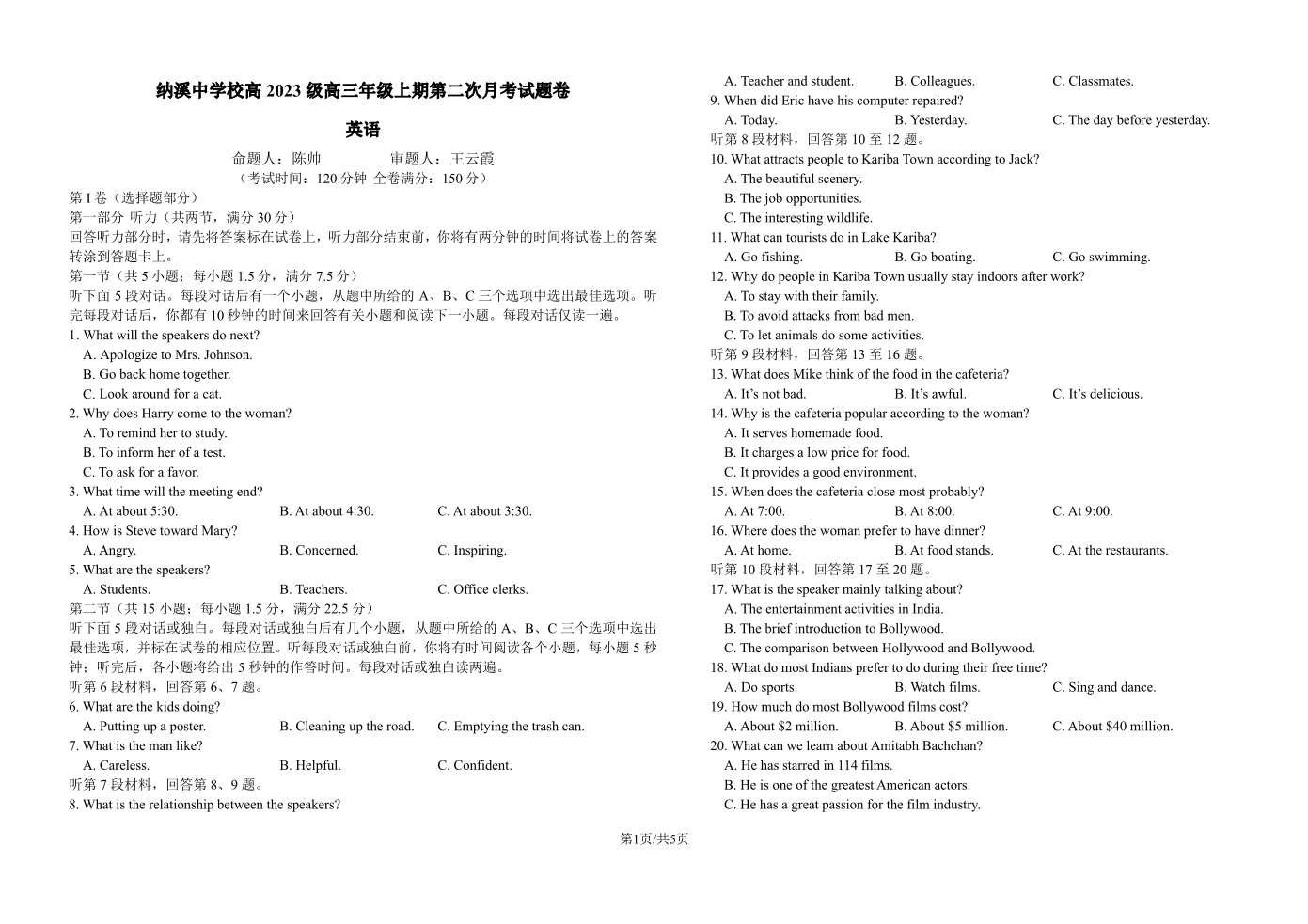 高三英语+答案--四川省泸州市纳溪中学校高2023级高三年级上期第二次月考