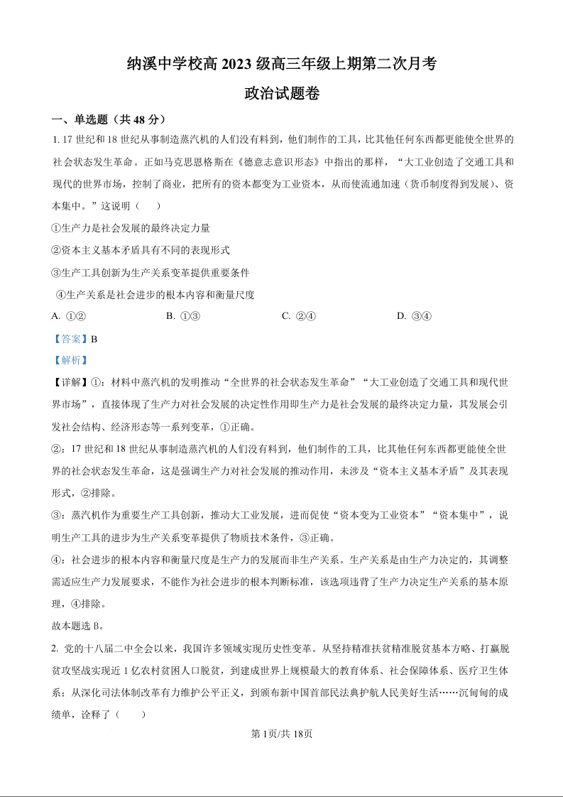 高三政治答案--四川省泸州市纳溪中学校高2023级高三年级上期第二次月考