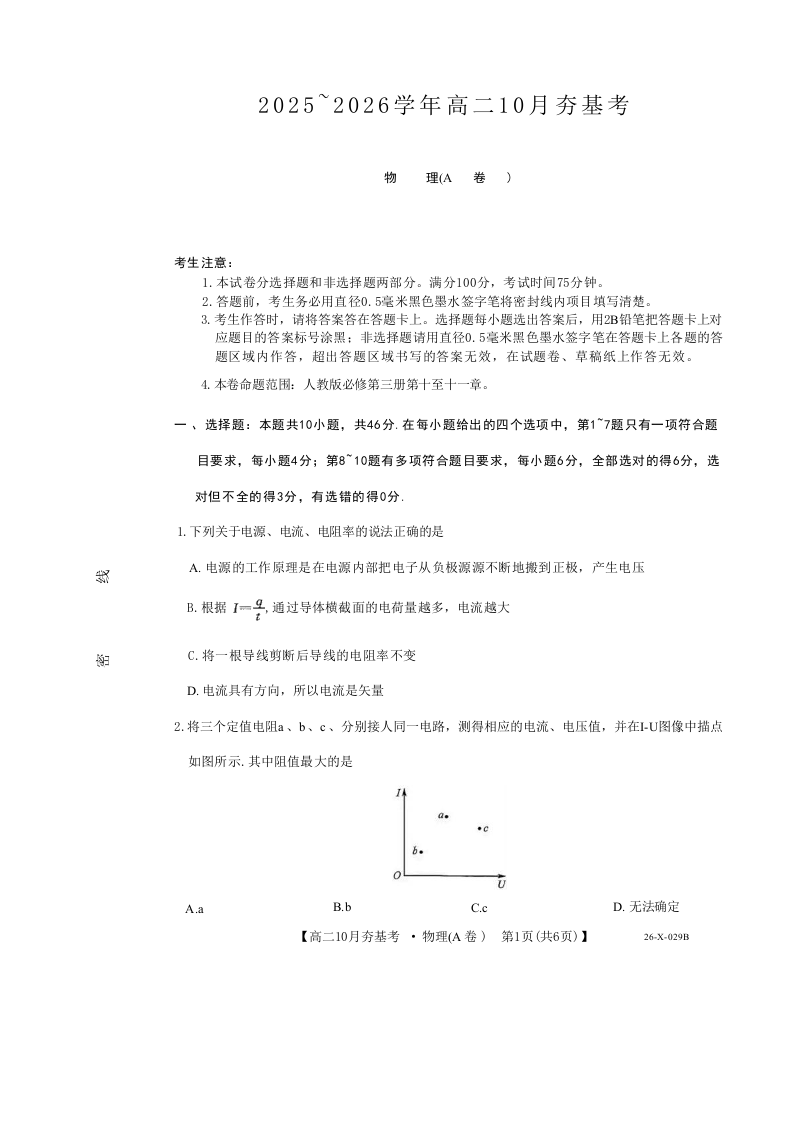 高二物理--山西省三晋卓越联盟2025-2026学年高二10月夯基考