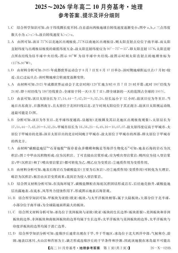 高二地理答案--山西省三晋卓越联盟2025-2026学年高二10月夯基考