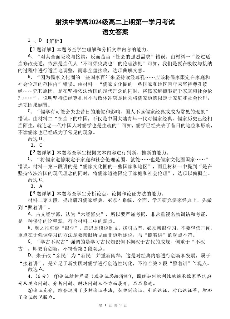 高二语文答案--四川省遂宁市射洪中学2025-2026学年高二上学期10月月考