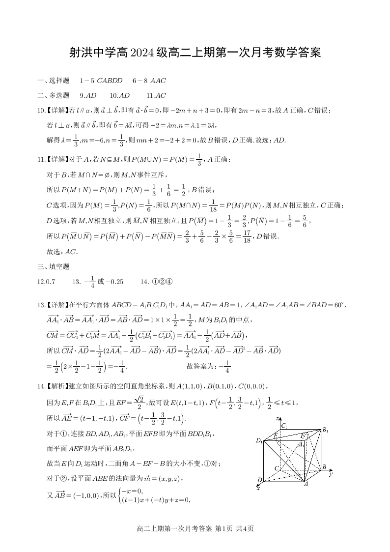 高二数学答案--四川省遂宁市射洪中学2025-2026学年高二上学期10月月考
