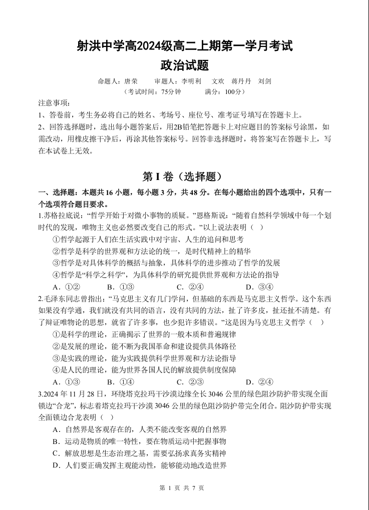 高二政治--四川省遂宁市射洪中学2025-2026学年高二上学期10月月考