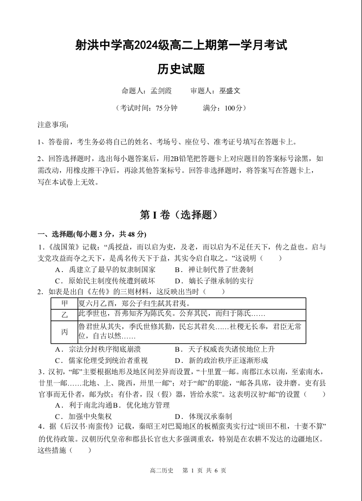 高二历史--四川省遂宁市射洪中学2025-2026学年高二上学期10月月考