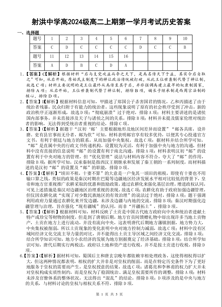 高二历史答案--四川省遂宁市射洪中学2025-2026学年高二上学期10月月考