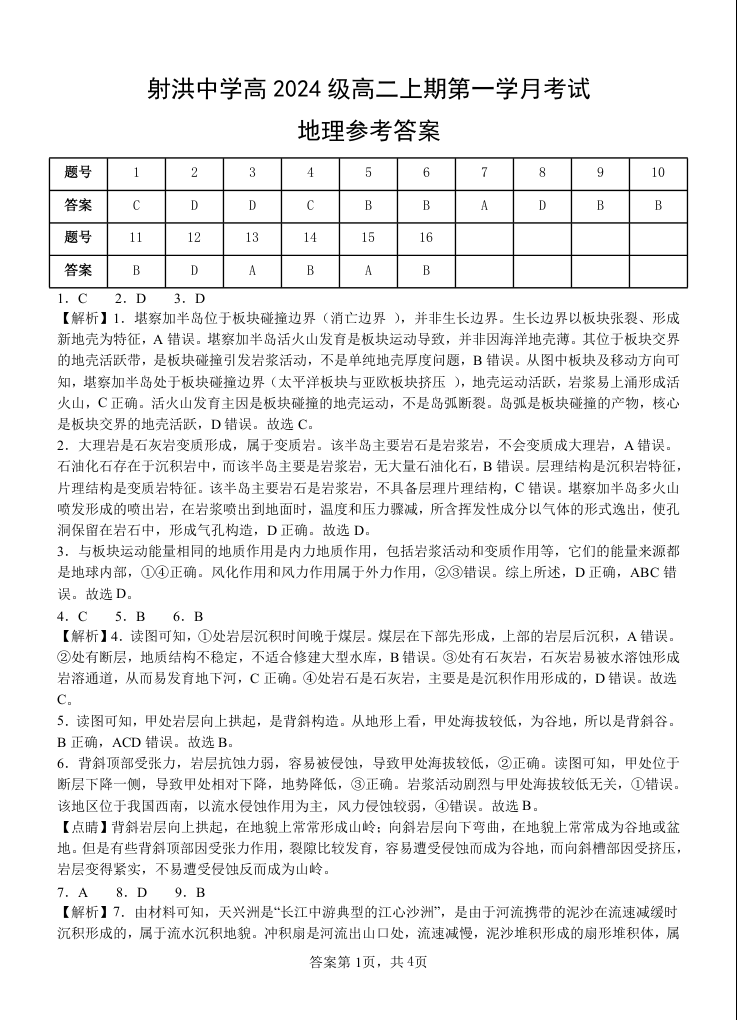 高二地理答案--四川省遂宁市射洪中学2025-2026学年高二上学期10月月考