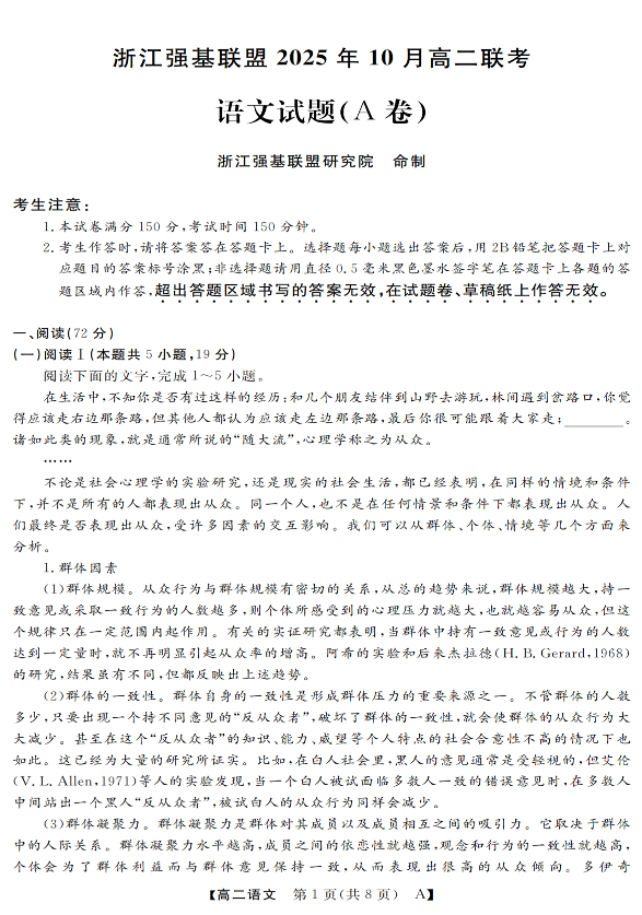 高二语文+答案--浙江省强基联盟2025-2026学年高二上学期10月联考A卷