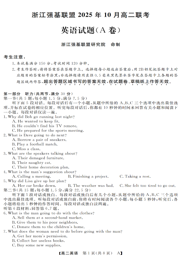 高二英语+答案--浙江省强基联盟2025-2026学年高二上学期10月联考A卷