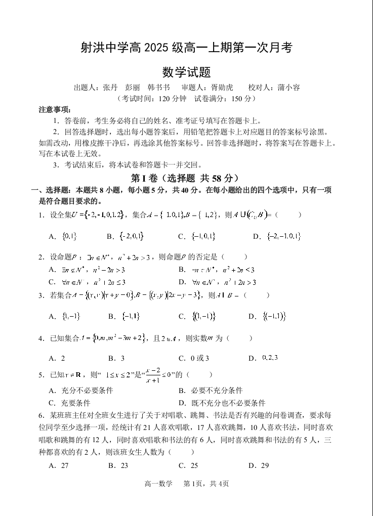 高一数学--四川省遂宁市射洪中学2025-2026学年高一上学期10月月考