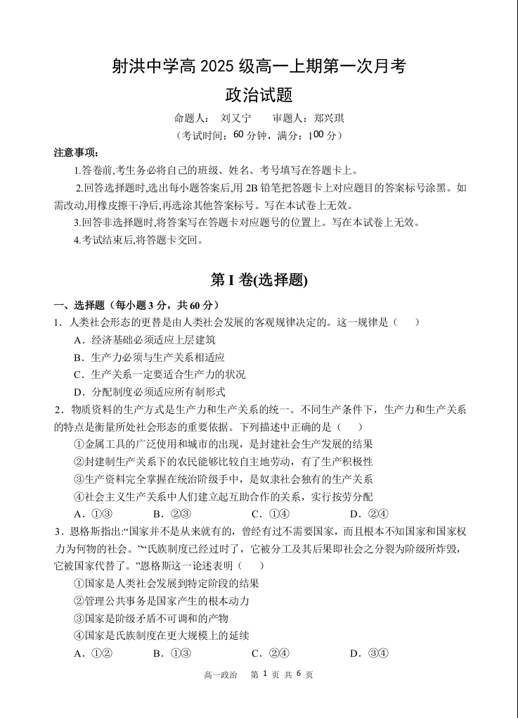 高一政治--四川省遂宁市射洪中学2025-2026学年高一上学期10月月考