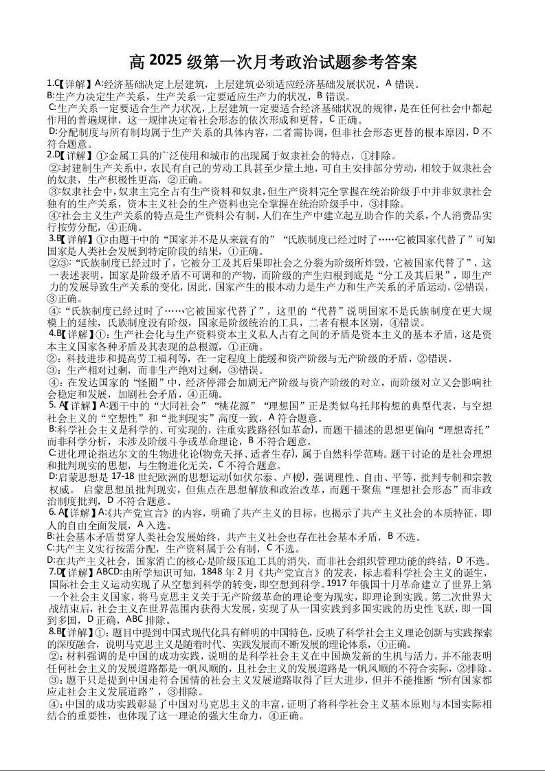 高一政治答案--四川省遂宁市射洪中学2025-2026学年高一上学期10月月考