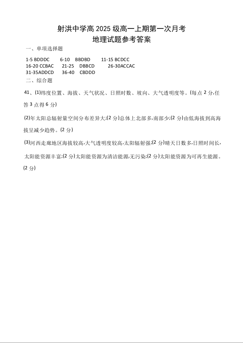 高一地理答案--四川省遂宁市射洪中学2025-2026学年高一上学期10月月考