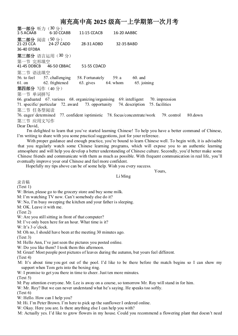 高一英语答案--四川省南充高级中学2025-2026学年高一上学期10月月考