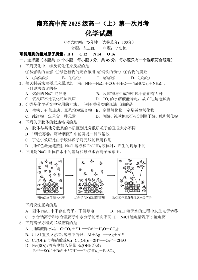 高一化学--四川省南充高级中学2025-2026学年高一上学期10月月考