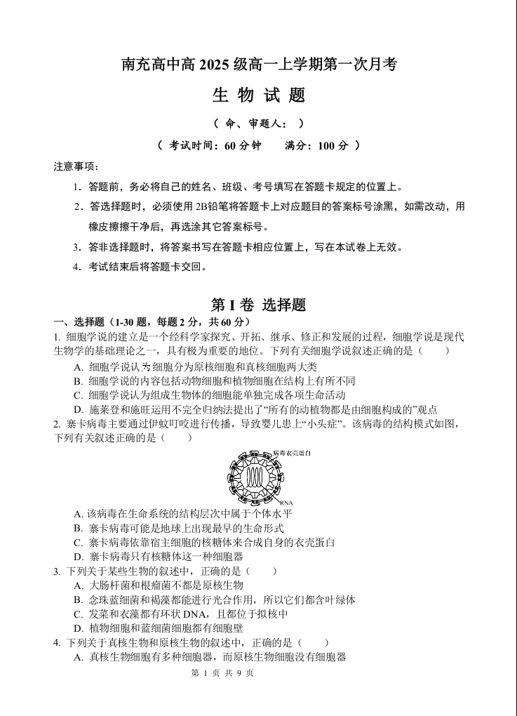 高一生物--四川省南充高级中学2025-2026学年高一上学期10月月考