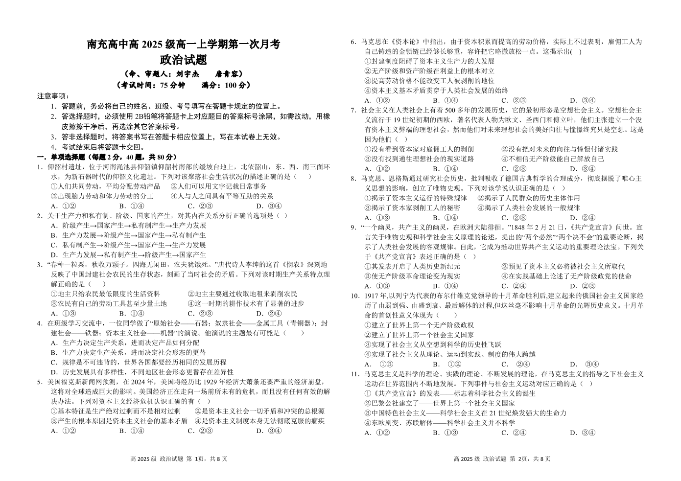 高一政治--四川省南充高级中学2025-2026学年高一上学期10月月考