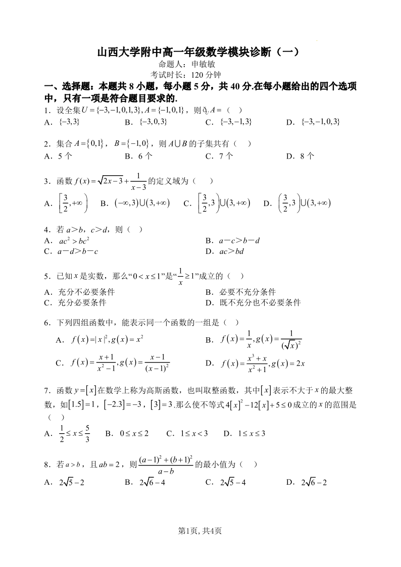 高一数学--山西省太原市山西大学附属中学校2025-2026学年高一上学期10月月考