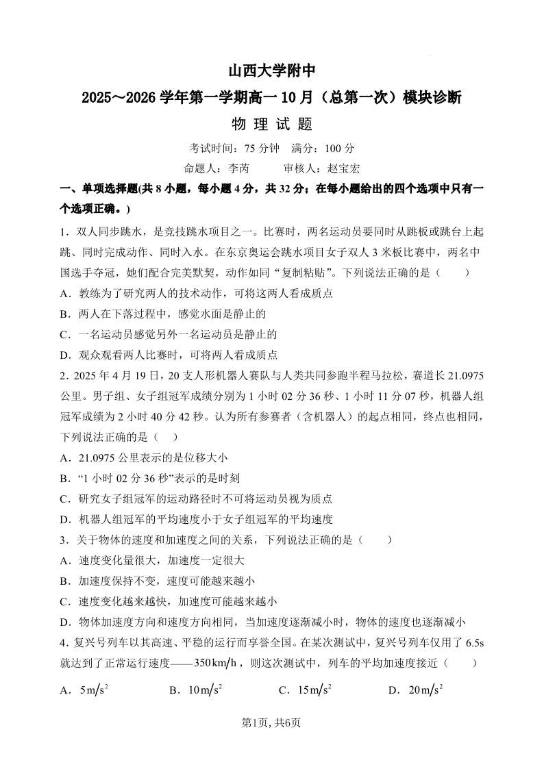高一物理--山西省太原市山西大学附属中学校2025-2026学年高一上学期10月月考
