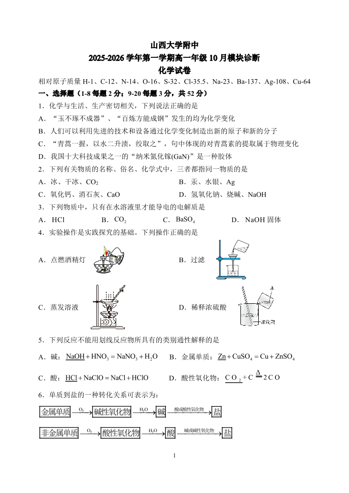 高一化学--山西省太原市山西大学附属中学校2025-2026学年高一上学期10月月考