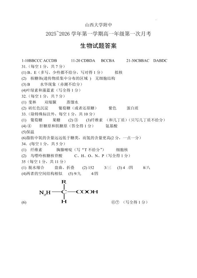 高一生物答案--山西省太原市山西大学附属中学校2025-2026学年高一上学期10月月考