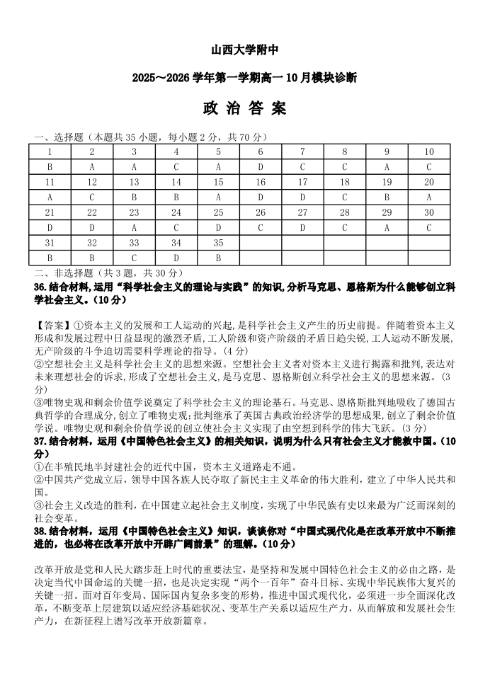 高一政治答案--山西省太原市山西大学附属中学校2025-2026学年高一上学期10月月考