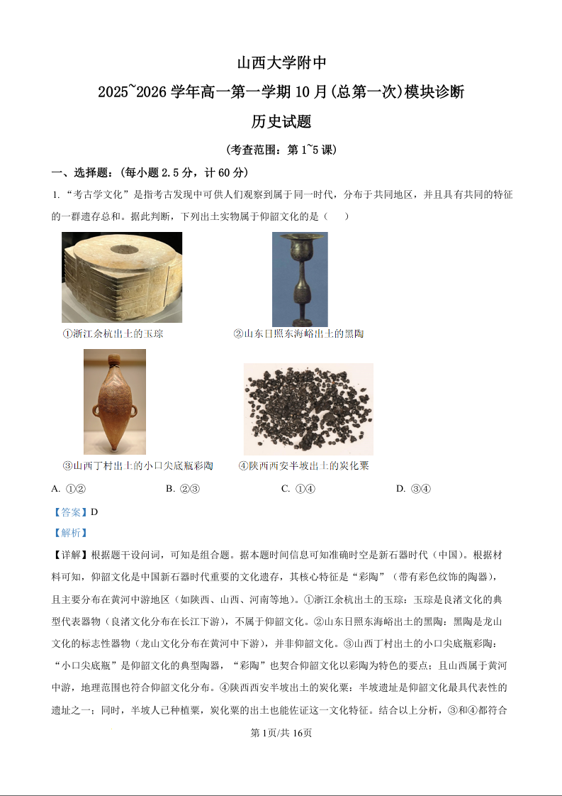高一历史(精品解析版)--山西省太原市山西大学附属中学校2025-2026学年高一上学期10月月考