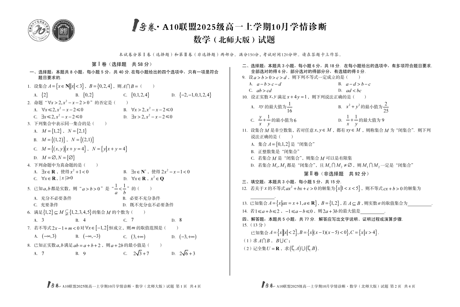 高一数学(北师大版)--安徽省1号卷·A10联盟2025-2026学年高一上学期10月学情诊断