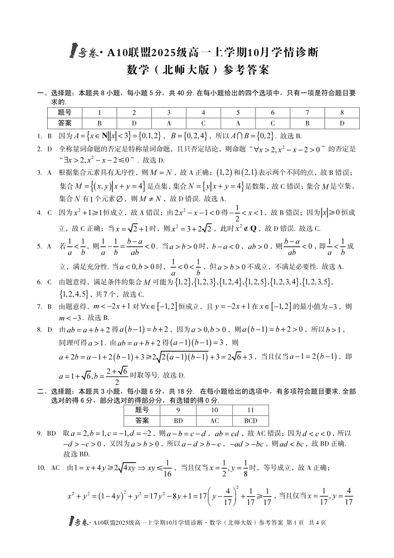 高一数学(北师大版)答案--安徽省1号卷·A10联盟2025-2026学年高一上学期10月学情诊断