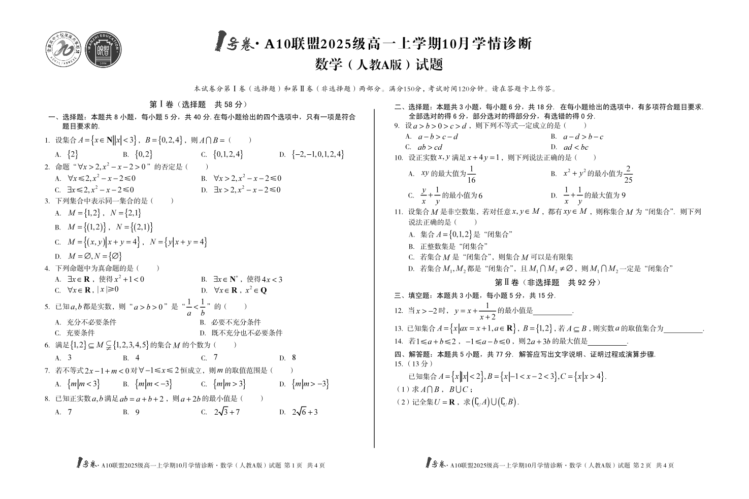 高一数学(人教A版)--安徽省1号卷·A10联盟2025-2026学年高一上学期10月学情诊断
