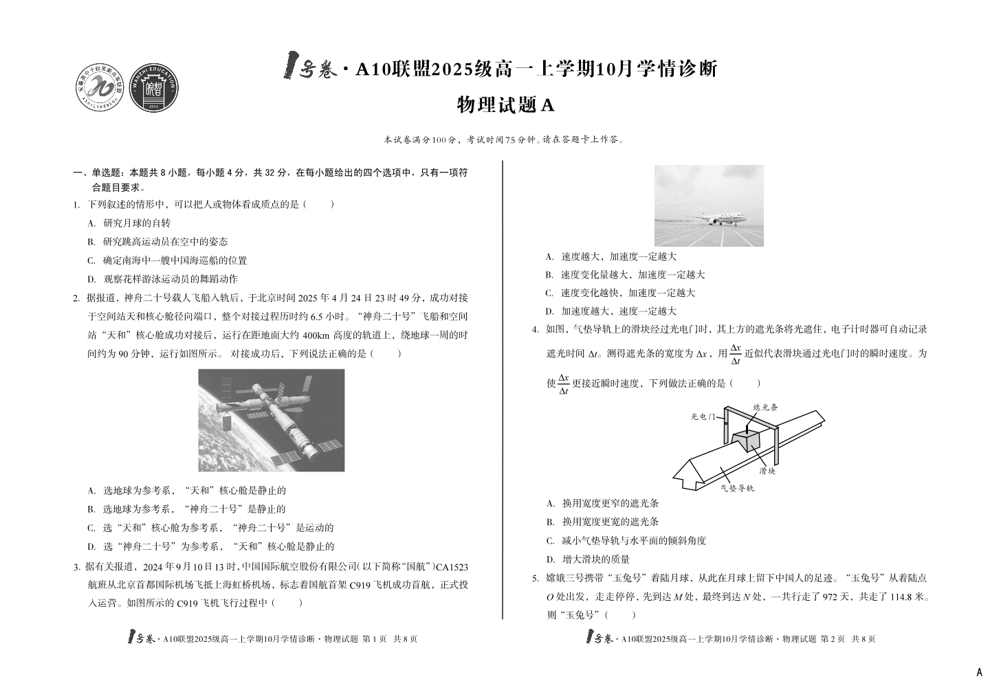 高一物理A--安徽省1号卷·A10联盟2025-2026学年高一上学期10月学情诊断