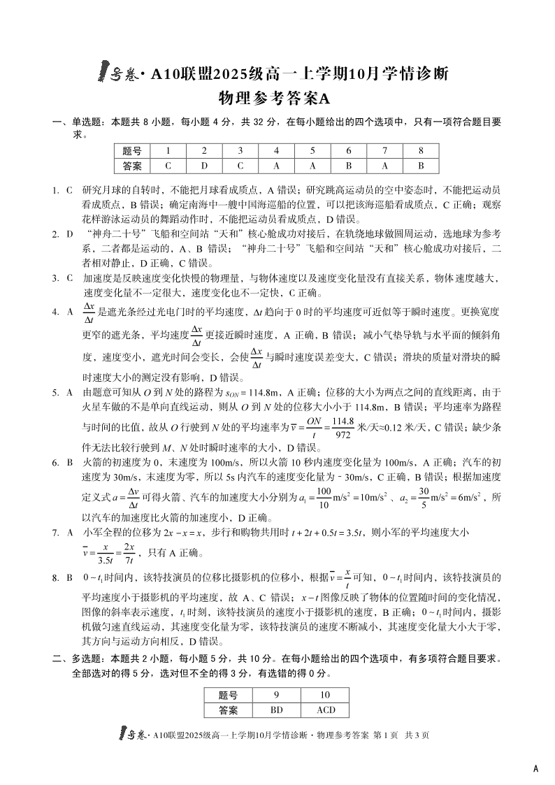 高一物理A答案--安徽省1号卷·A10联盟2025-2026学年高一上学期10月学情诊断